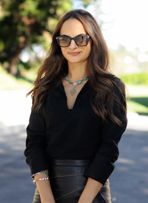 Black always looks chic and sleek, but creating a top to bottom all black outfit that looks great is an art that the French women have mastered. The key to the perfect all black outfit is to mix textures or to use pieces that are meant to be worn together like in the picture of Giovanna Battaglia. I love how Giovanna has paired her all black skirt suite with statement sandals. If you are wearing black pants or jeans with a black top, it's best to break it up with a belt to let the two different items stand on their own without competing.